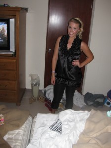 Outfitbild i ett stökigt hotellrum 😉