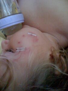 elin - stackars lilla plutten 🙁 vilken tur att hunden inte bet henne nära ögonen. huuua!